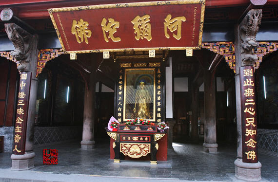 走近寺前,只见古色厚朴的围墙盘绕在古刹四周,正门上嵌着“文殊院”三个大字,与围墙上“南无阿弥陀佛”、“庄严国土、利乐有情”、“世界和平、人类幸福”相映衬,使文殊院显得十分庄严、肃穆。
