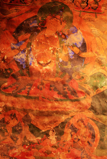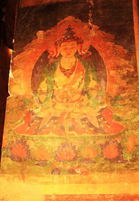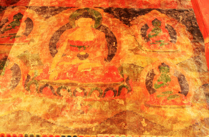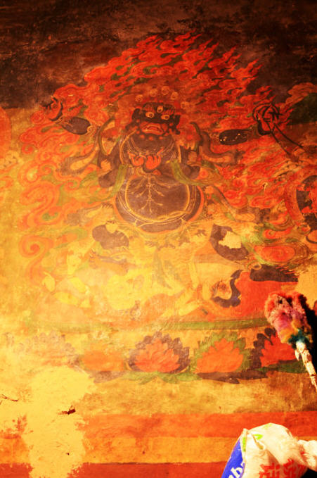 寺院很古老,朝佛的也都是藏人。壁画不是常见的艳丽色艳,而是采用白描的方式,四壁天蓝一片,蓝底白线的壁画,如同凡尘中的一朵青莲,那些细致入微的线条,漫延整个视线。只可惜四壁照进阳光的地方,天蓝退去了色彩,惨白一片,望着残缺不全的壁画,无限的遗憾。渡入大殿,淬不及防被大殿四周的壁画再次将击中,色彩暗哑却精彩绝伦的壁画,穿透了时空将我摄住。冥冥中,甘孜停留四日,便是要我与它们想见,呆呆的望着它们,转不动脚步,在它们跟前不停的来来回回,只想把它们看进心里去。这些壁画有700多年的历史,汉人寺是甘孜县内最古老的建筑,整个寺庙藏汉结合,也是藏汉团结的象征,所以叫汉人寺。
