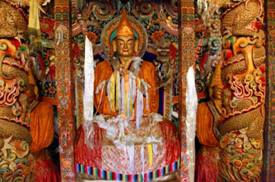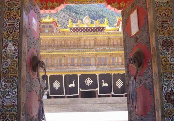 走向正殿,首先可以瞻仰正殿大门外两旁墙壁上所绘的“四大天王”、“生死轮回图”等壁画。进入正殿,一根根大红、笔直的四方柱子,构成一座红色丛林,僧侣们或盘腿吟诵,或焚香跪拜。正殿底层是雕塑佛像群,在这些匠心独运的塑像中,最宏伟的要算宗喀巴铜质镀金佛像。佛像净高18米,加上佛座,总高近30米,是藏族聚居区最大的殿内铜像之一。佛像群中最珍贵的是千手观音像和大白伞盖佛母像,两尊佛像均高达两米,其造型精美、刻画细腻、形象生动,塑像是用香柏、松石、玛瑙、珊瑚、珍珠、宝石等与各种药材磨细后,同牛胶混合塑筑而成,再用九眼珠、宝石、珊瑚等镶嵌,并以金银装饰。