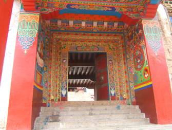 桑披岭寺最重要、建得最讲究的是东大门。大门的门柱是两根整木圆雕,雕刻的是藏民族信奉的“以和为善”的信物图“和气四瑞”——大象、灵猴、兔子和吉祥鸟。大门的门梁上雕刻有虎、狮、雕、龙四宝兽。进入东大门,便来到跳神坝。该坝占地3335平方米,因用于举办跳神节的场所而得名。坝子用鹅卵石铺砌而成,最独特的是坝子中间用黑、白两种圆卵石砌出了佛教的吉祥条纹“喜旋珠”及“吉祥边围图”。