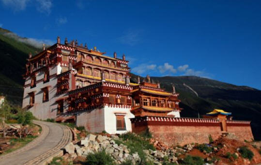 桑披岭寺位于四川省甘孜藏族自治州乡城县的巴姆山麓,全称是噶丹桑披罗布岭寺,始建于清康熙八年(公元1669年)。“噶丹”表示传承格鲁派祖师宗喀巴首建之西藏噶丹寺的名系,“桑披”在藏语中意为“遂心如意、兴旺发达”,“罗布”则是“宝贝、神物”之意。由此可见,桑披岭寺在藏族人的心目中就是一座令人“遂心如意、兴旺发达的宝寺”,是乡城人心中的圣地。桑披岭寺在整个康巴地区以其宏大的规模、精湛的雕刻和绘画艺术、悠久的历史而著称。
