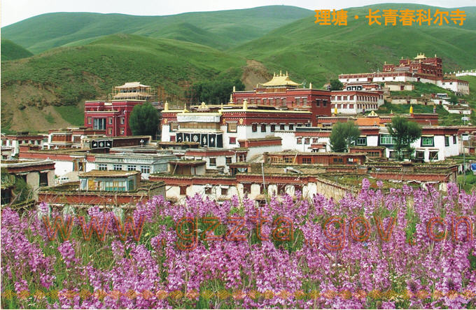 长青春科尔寺又称理塘寺,于1580年由第三世达赖喇嘛索南嘉措创建,是康区历史最悠久,规模最大的藏传佛教黄教寺庙。长青春科尔为藏语译音,“长青”意为弥勒佛(即未来佛)“春科尔”意为法轮,“长青春科尔”意为弥勒佛法轮(标志着法轮常转、妙谛永存)。寺庙占地500余亩,坐北朝南,背靠崩热神山和多闻正神山。相传三世达赖索南嘉措在安多地区(青海)传经返藏经过理塘时,按途中巧遇的诸多吉祥征兆,在这里看到一处奇境——背面(北面)山势特高,像一尊财神盘腿而坐,手持珍宝;右面(西面)山岳十分壮观,像一只巨鹏展翅欲飞;左面(东面)山岳非常奇妙,像一头巨象曲身而卧,从北向南伸直长鼻,两腮处的清泉像两条洁白的哈达,从象鼻两侧潺潺流过,左侧是无量寿甘露,右侧为莲花生甘露;对面(南面)山峦起伏,奇峰耸立,主峰山腰自然形成一幅十相自在图文。山麓下汹涌的理塘河宛若青龙盘旋而行,中间宽阔的大草原芳香四起,其间肃立着相传当年文成公主进藏时吩咐兴建的菩提白塔,奇观美不胜收,与900多年前,印度大师阿底峡尊者在《噶当弟子问道录》中的预言相同。欣喜之下,索南嘉措在貌似巨象长鼻鼻梁的山岳间兴建了这座长青春科尔寺。因长青春科尔寺的这段传奇故事,使该寺名声大振,在藏区素有“上有拉萨三大寺,下有安多塔尔寺,中有理塘长青春科尔寺”的说法。