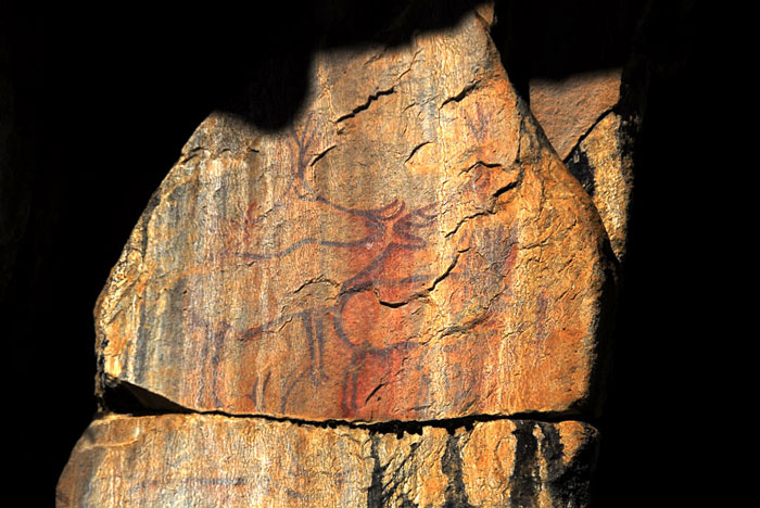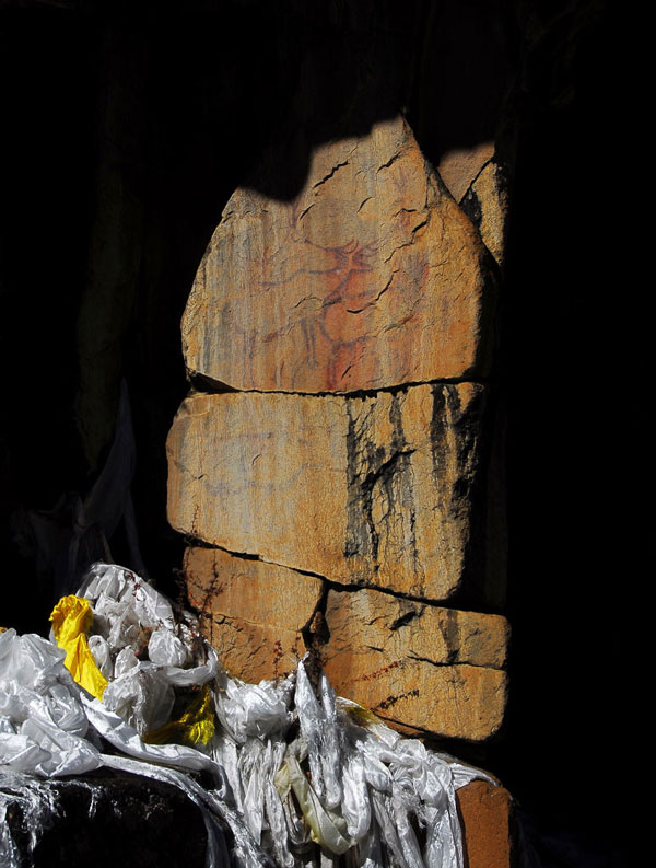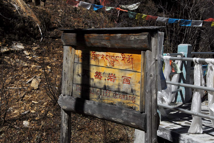 在后山的岩壁上,有很多古老的岩画和修行的山洞,其中有一幅古老的文字,是噶玛巴·都钦松巴用自己的鼻血亲手所写,千百年来无人能破解其意。1999年西藏高僧阿公活佛来蚌普寺,终于揭开了千古之迷。这段藏文的意思是:“我走遍康区,这里是最美丽的地方”。