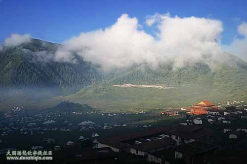 从整体上看,整个多智钦寺的地形形如一个仰卧著的绝色佳人,这种地形被称之为“魔女仰卧”,这种地形是世上罕见的。“魔女仰卧”这种地形的含义有两方面:一种是“圣地”的意思,具有这种特征意味著此地乃圣地;另一种是“凶地”的意思,是指这种地形是地形中最极之凶地,凡夫不堪承受,但是这种地形一旦由登地以上的菩萨镇服,即成为密法修习最理想之圣地。在我们这个南瞻部洲,雪域西藏正是这种“魔女仰卧”的地形,拉萨位于其心脏地带。正是由于观世音菩萨化现之藏王松赞干布在“魔女”的心脏之地修建了供奉世尊释迦牟尼等身佛像之大昭寺,使拉萨成为伟大的佛教圣地,西藏亦成为显密佛法兴盛之中土。