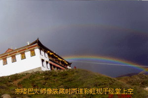 春夏之际, 草原上碧水青天,寺院前面那宽阔的大草地上缀满黄花,牛羊成群,一派世外桃园的景象。草地上有洁白如哈达般的河流旋绕,形同汉地的太极图。对此地所具的各种吉祥表征,班禅大师称赞不已。后来人们把这个地方称为“班禅色尔塘”,意思是班禅黄金大道。