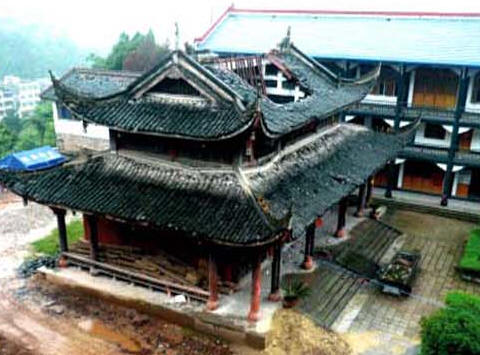 1987年3月,盐亭县人民政府批准,重建凤灵寺于董政山腰柏林中。1988年6月,修建竣工仿古结构的大雄宝殿,建筑面积403千方米。同年10月塑造佛像和十八罗汉共24尊,在四面墙壁绘画了释迦佛的故事。1992年2月新建竣工韦陀殿,建筑面积为549平方米,巍峨雄势,富丽堂皇,红墙青瓦,雕花门窗。1989年3月动工修建千手千眼四面观音殿,建筑面积为265平方米,青瓦屋,重檐翘角。在观音殿的前壁上悬挂着一道大匾,从不同方向看,有不同颜色和不同内容的文字,正面看是“慈航普渡”,左面看是“大慈大悲”,右面看是“普渡众生”。正中莲花坐台,内塑高7.5米11个头、1008只手的四面干手观音一尊,庄严慈祥。正中壁上悬挂全国政协副主席、中国佛教协会会长赵朴初书写的“观音殿”三个朱红大字的墨漆匾。1990年5月修建办公室连住宿二楼一底的综合用房24间,建筑面积733平方米,1995年底竣工圆通宝殿215.8平方米,琉璃构件,内塑座式观音塑像,令人耳目一新。