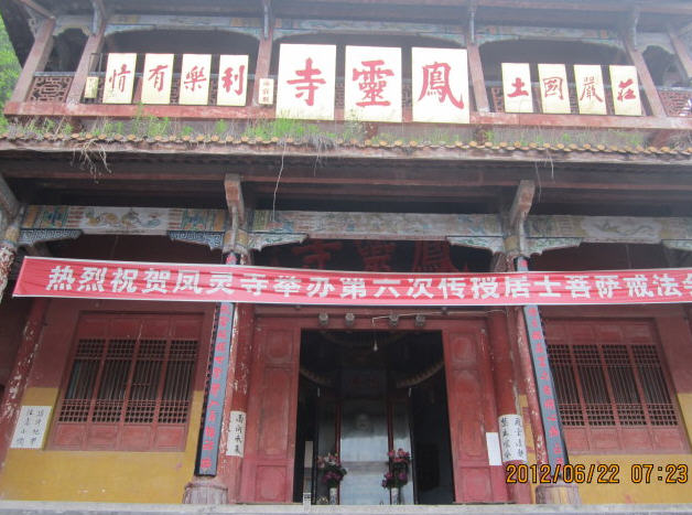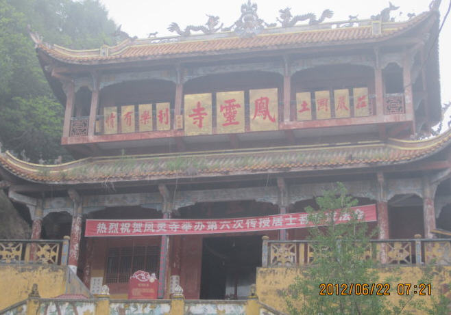 1992年4月在凤凰山麓,修建仿古结构重檐歇山式的天王殿一座,建筑面积297平方米,以此殿代寺山门。阶沿上的六根大柱立于六个垂莲磉凳之上。现在,整个凤灵寺密林围护,郁郁葱葱,远山起伏,氤氲弥漫。寺院建筑巍峨壮观,气势恢宏,绚烂多姿。年年岁岁吸引着众多佛教信徒来此磕头,诵经念佛。