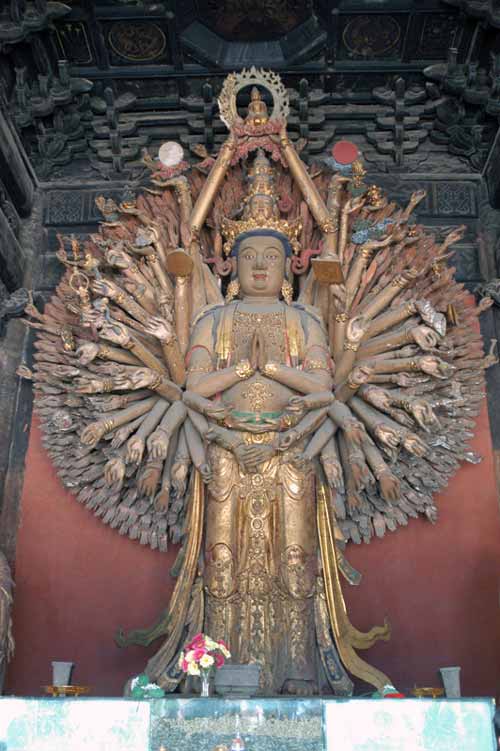 主要景点:有天王殿、大雄宝殿、万佛阁、大悲殿、华严藏、南北碑亭、三桥、钟楼、山门等。殿内泥塑、木雕、石刻和壁画,无不精雕细刻,美妙壮观。其中楠木雕千手观音,高8米,千手各异,美妙壮观;转轮经藏高11米,六面七层,镂空雕刻,工艺精湛;万佛阁斗拱200余垛,实属罕见;大雄殿和万佛阁内有壁画40余平方米,形神兼备,色彩绚丽,是研究明代民间绘画的极有价值的实物。