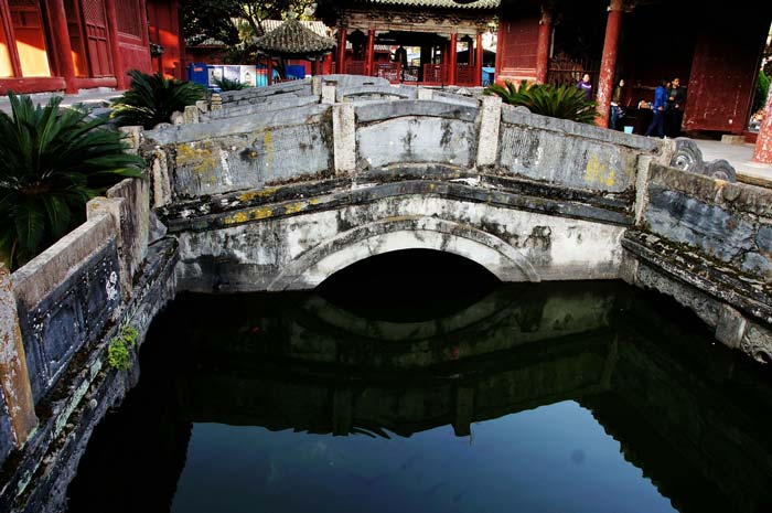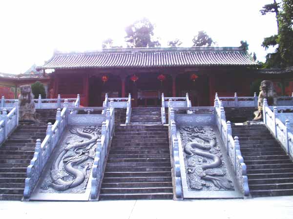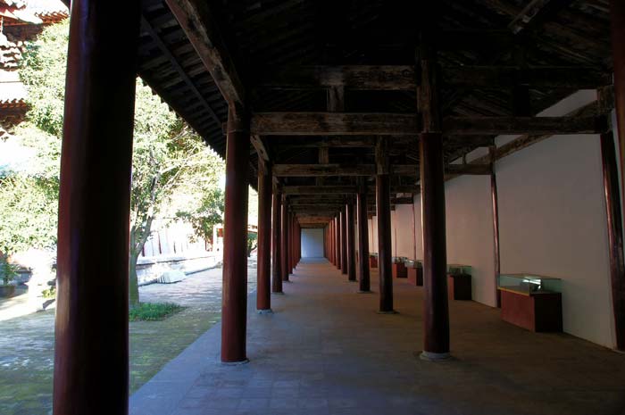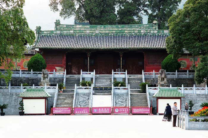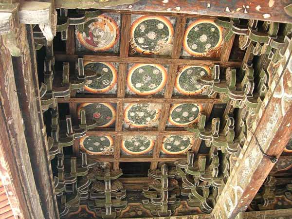 大殿五间,重檐歇山顶,两侧有斜廊与东西庑相联,这种明代常用的斜廊,现在遗物已极稀罕。各殿天花以下露明部分均用官式做法,而天花之上则用穿斗做法,在结构上与泉州开元寺有相似之处。