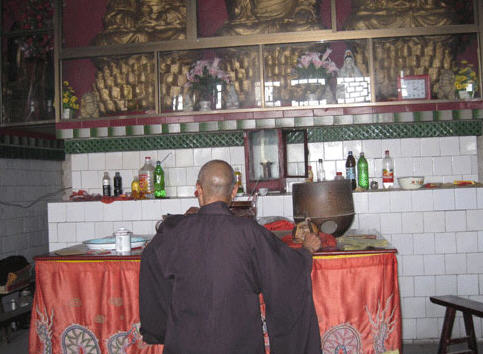 我们去时恰好是中秋节的正午,寺内还有好多人在等待。待我们加入后,下午三时许保烛开忏。我们都到大雄宝殿外左侧的“香烛亭”里点烛烧香。只见香烛亭门上的对联是:
