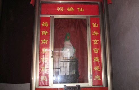那天正值管委会及周边三镇相关人士在寺内开会,筹办开光暨奠基事宜,里边就有彭正愚、胡子求、胡保堂、刘科堂、王益谦等几位相识的老同志。我就找管委会负责人彭正愚君打听此事。事又碰巧,彭君正是“得梦人”。他在百忙中挤出时间向我简单地介绍了仙鹤的由来:2008年农历5月,根据寺内住持释智度、释常受的提议,在大殿后取一条排水沟坑,并将阶基用水泥砂浆粉刷好。施工中挖附堪时,泥土中发现一只栩栩如生的石鸟,就把它珍藏起来。今年农历的5月22日晚上,彭君在熟睡梦见一位白发长须身穿白袍的老人对他说:“南泉寺降了一只仙鹤,你们要保护它,敬奉它,要建祠安妥,香火会更旺。”同时叮嘱他待祠建好后,要题上神联。白发长须白袍老人还当即吟出了神联的内容: