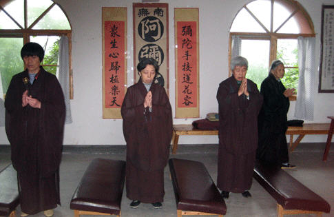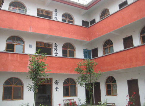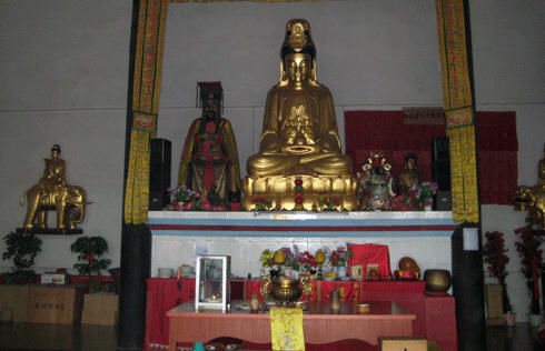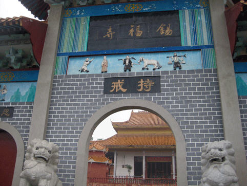 锡福寺的寺门高大雄壮,两只石狮忠于职守立在寺门两旁。进大门就看见大雄宝殿,我们去时大约是上午11点,正碰上是法师们课经念佛的时候,大殿里空无一人。观音菩萨、财神爷、还有叫不出名的骑着狮子、坐着大象的菩萨及两旁的罗汉菩萨非常慈善的看着我们走进大殿。我们便一个个作揖,然而,经堂里接连不断的“阿弥陀佛”“阿弥陀佛”的唱声抑扬顿挫的飘了出来,我们便告别了菩萨们,持着相机上了“念佛堂”。原来这里有六七个尼姑身穿法袍,双手合十,绕着堂内不停的唱着“阿弥陀佛”的佛经,为头的手里还拿了个铃铛,边走边唱便发出锐耳的响声。她们对于我们的到来,好像视而不见,一个劲地虔诚地念唱着“阿弥陀佛”。也不知他们一天要念多久的佛,直到午饭时分,我们离开时,他们的课经念佛活动还没结束。当我们绕着一条巨龙似的围墙来到了回形山顶上,那“阿弥陀佛”的念唱声还缭绕在耳旁呢!