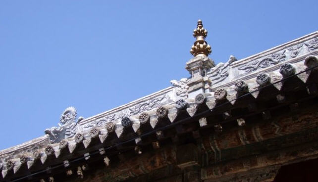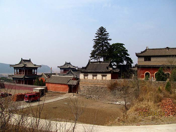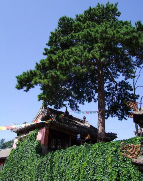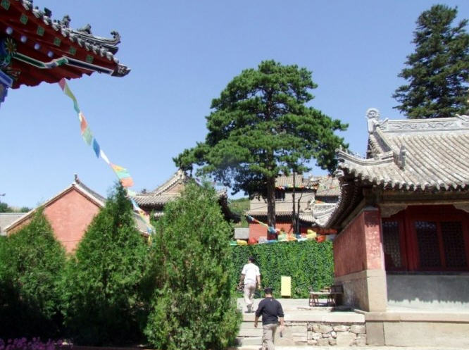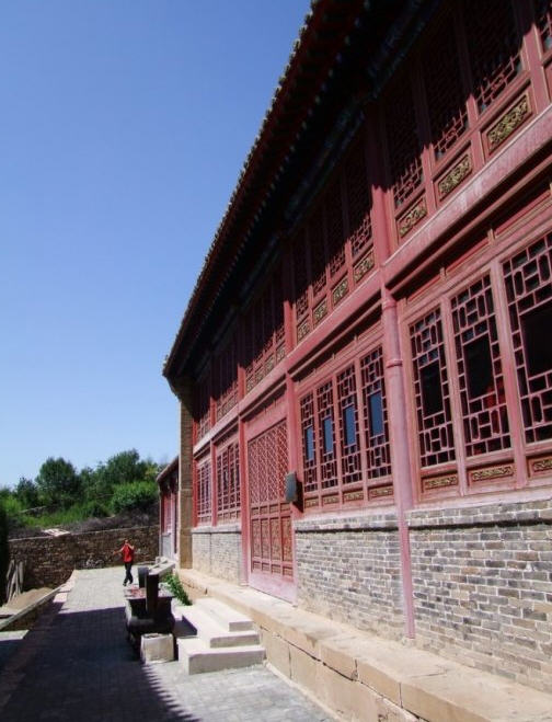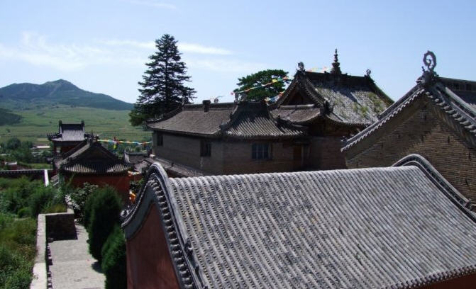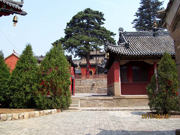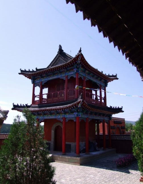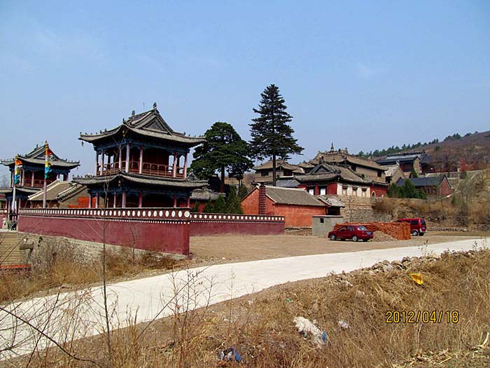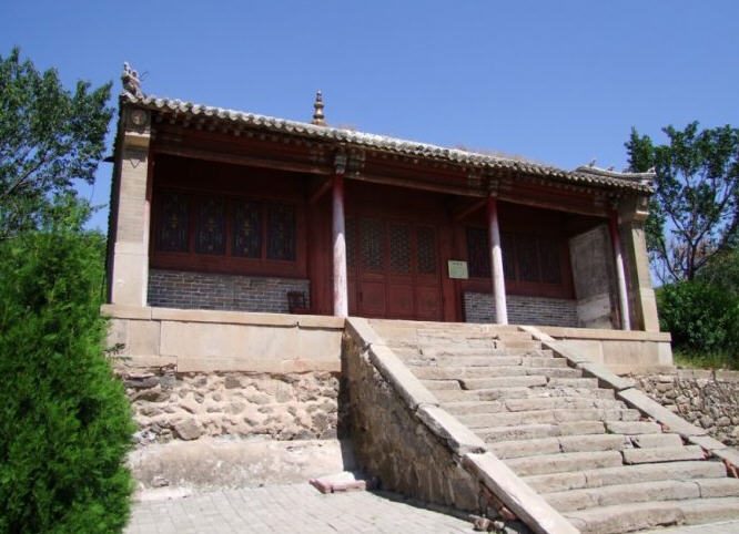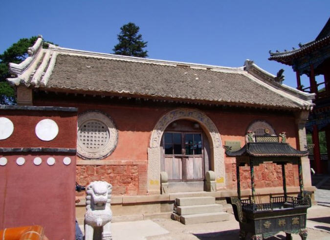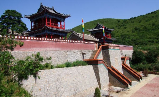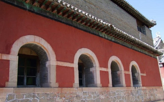 天王殿面阔三间,进深一间,前后施廊,供四大天王。天王殿兼作三门,也写作山门,因寺院多居山林而称之。前面便是石砌院墙,墙外大沟深10余米,受地形所限,将寺门开在偏西一侧,这是与其他寺院不同之处。从三间歇山式的四方殿(也称罗汉殿)后面拾级而上,是第二道平台,大经堂及左右配殿建于此。