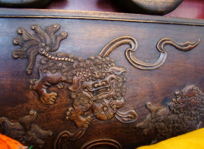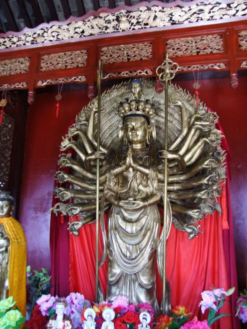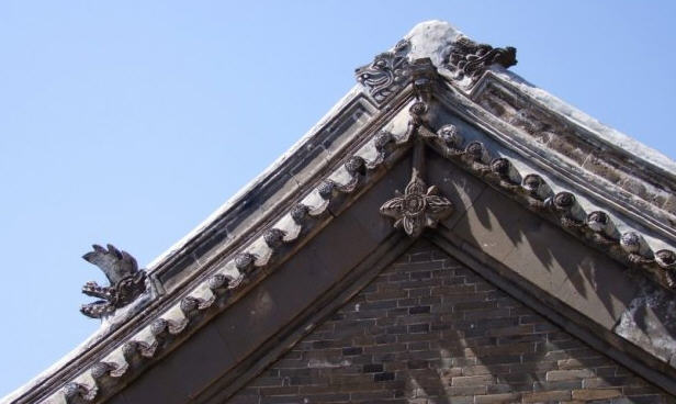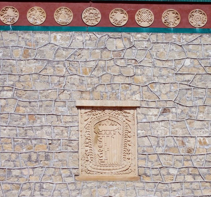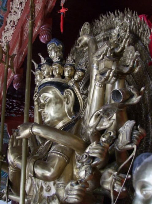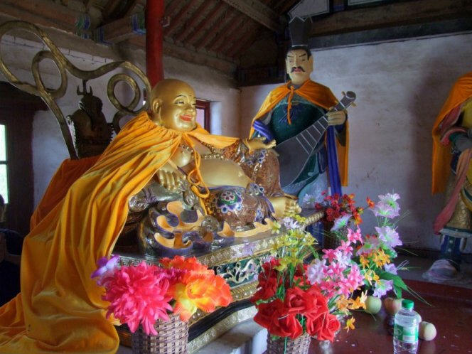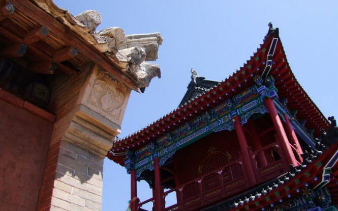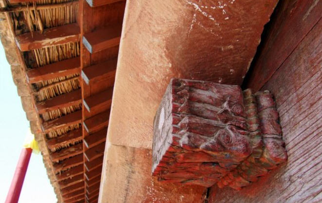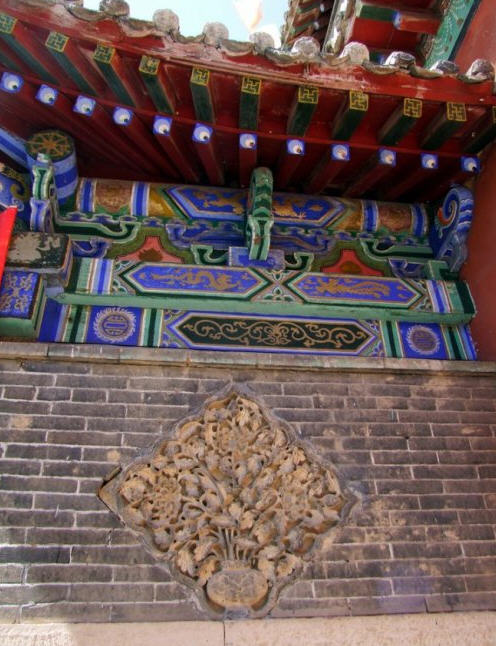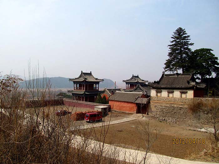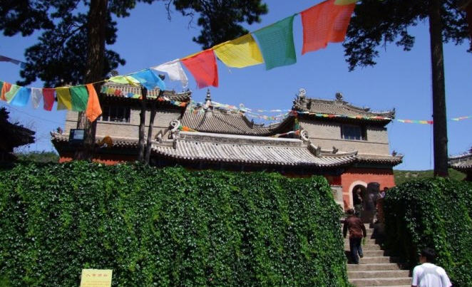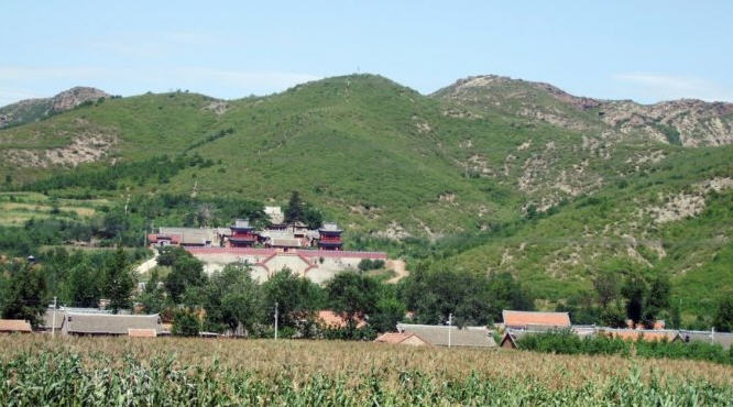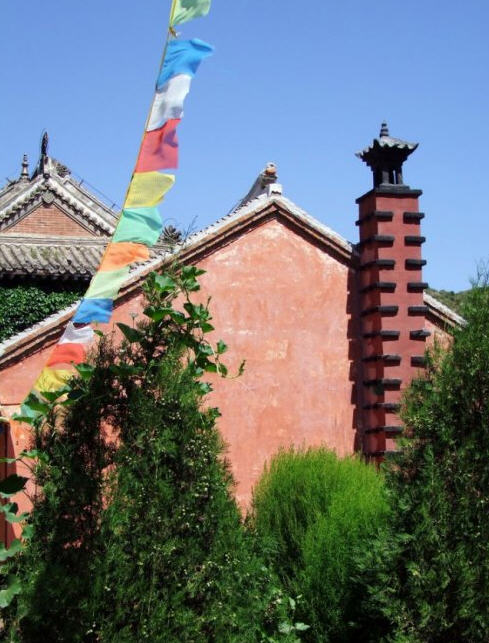 天王殿面阔三间,进深一间,前后施廊,供四大天王。天王殿兼作三门,也写作山门,因寺院多居山林而称之。前面便是石砌院墙,墙外大沟深10余米,受地形所限,将寺门开在偏西一侧,这是与其他寺院不同之处。从三间歇山式的四方殿(也称罗汉殿)后面拾级而上,是第二道平台,大经堂及左右配殿建于此。