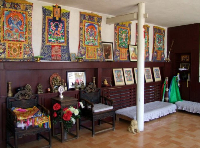 大经堂(或称诵经堂、大殿)为藏汉式建筑,有两层,第一层由前廊、经堂、佛殿组成。二层中间为方形三间歇山式,屋顶饰井式天花,彩绘以龙和梵文六字真言为主题,两侧建有回廊。在建筑形式和装饰内容、色彩上,融合了汉族和藏族两种庙宇建筑的传统风格。