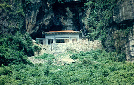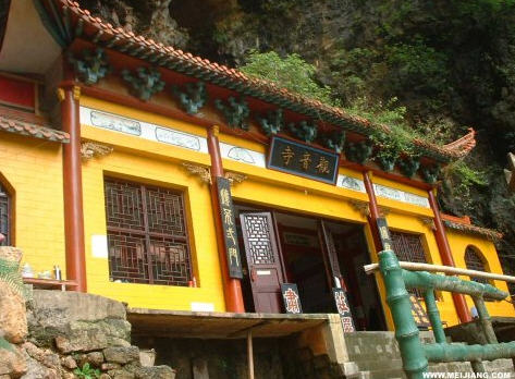 正中峭壁上有天然石穴,状如巨龛,原为药农遮风避雨之所。清朝雍正年间,云游野僧,见而奇之,暗移观音塑像于龛中,谣曰:“南海飞来”。好事者推波助澜,募集巨款为之立寺。建筑师心灵手巧,于石龛四周峭壁上凿石孔以立柱、插梁,筑成傍崖悬楼。远望如鸟笼挂壁,宛若山西省浑源县空寺。