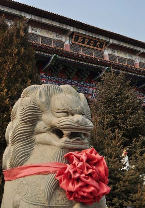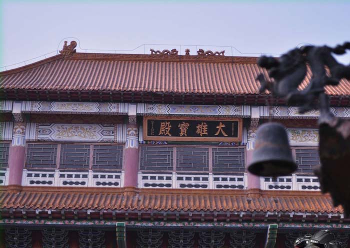 重建后的大雄宝殿占地约3.9亩,高21.1米,人称东北地区圣殿之最。殿内有通天圆柱4根,日月方柱2根,围撑支柱12根,象征着佛光普照,四面八方及地支十二。殿外回廊支柱28根,象征二十八星宿护法至高无上的佛祖。殿前台阶共33步象征佛祖与菩萨高属在33天之上,三层回廊192尊雄狮,气势磅礴,雄伟壮观,殿内漆金三世佛祖,观音菩萨,十八罗汉形态逼真,栩栩如生。整座大雄宝殿雕梁画栋,金碧辉煌,琉璃瓦镶嵌金龙,彩绘有仙人、飞禽走兽。殿内北钟南鼓,香烟缭绕,僧人居士云集,鼓乐齐鸣,鼎盛至极,参拜的居士,观光的游客极至而上,络绎不绝。置身于宝殿中顿生超凡脱俗之感,遥望群山心旷神怡,犹如世外桃源之圣地。