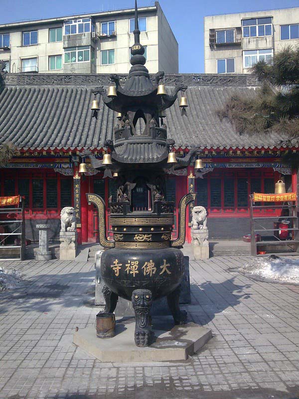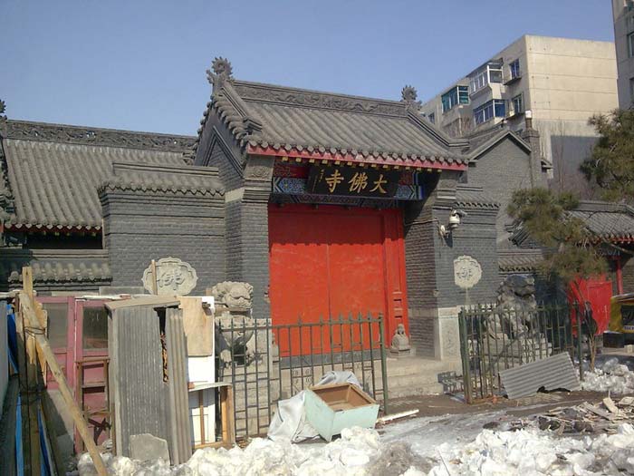 大佛寺位于辽宁省沈阳市沈河区大南街三段慈恩寺巷14号,古名“保安寺”.坐北朝南,两进院落,大隐于居民区内,山门没有想象中的大,和周围的居民楼相比,小巧但不失庄重,低矮却异常肃穆。山门有三个门洞,中间的大门洞还有两旁的石狮,用铁栏杆围起来,并不打开。平常时间,寺院只开东侧的小门,接待香客。到了初一十五这样的日子,又只开西侧的小门。山门前还有一棵小小的松树。