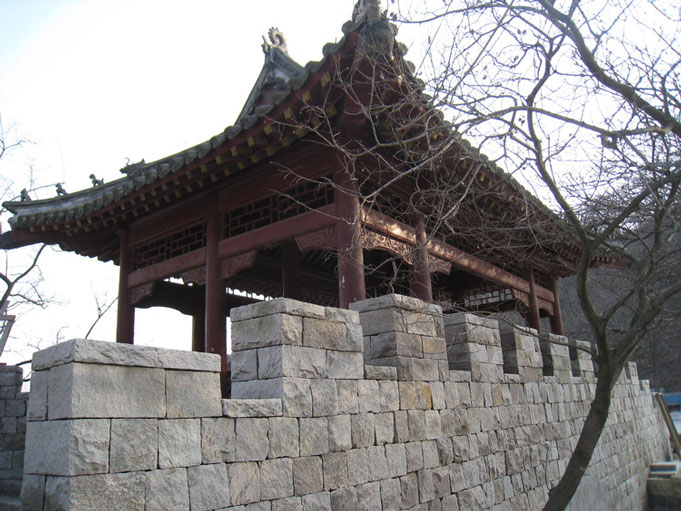 四、现状:清泉寺坐落于普兰店市星台镇葡萄沟的巍霸山中,它顺山势逐层高起,气势恢宏。东西长279米,南北长129米。清泉寺又叫吴姑城庙,吴姑城一锥把式丁字形花岗岩石块所筑,现存墙高2—9米。此城虽经千年,但保存基本完好。碑文所载为“东汉光武中兴”时建造。距今已有一千八百多年历史。他共有四个部分:第一部分为山门楼、汉白玉诗屏;第二部分为佛殿、二圣殿、药王、龙王诸殿、钟楼、鼓楼、石碑;第三部分为玉皇阁、老君殿;第四部分金母殿。古地面积4500平方米,建筑面积9800平方米。清泉禅寺建筑风格古雅别致,硬山式与歇山式相衔,虽为佛寺,却儒、释、道三教荟萃为一体,被誉为“辽南第一寺”。