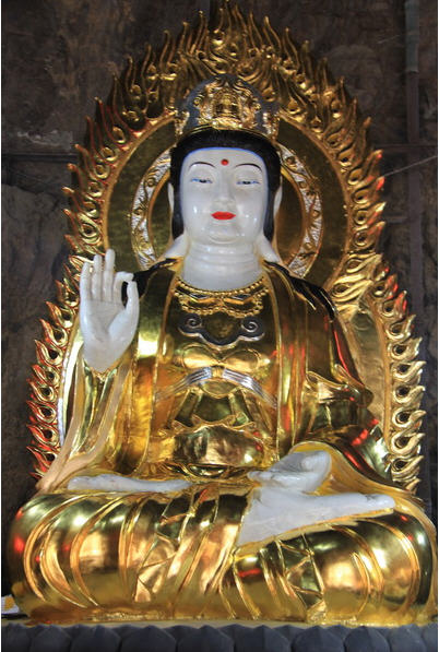 出天王殿,会看到一尊清白如玉,高25米、重百吨的辽西第一大佛——滴水观音,她面目清秀,体态丰润,通身清白,玉袖临风,把滴滴圣水洒向前来朝拜的人们。据说当时锦州地区久旱无雨,大地龟裂,众生告急,观世音菩萨当即挥洒柳枝普降甘露,解除灾情。