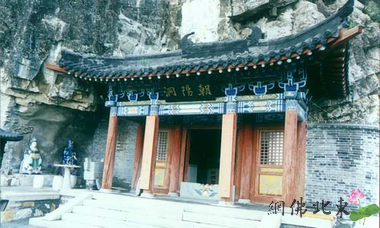 朝阳洞俗称卧佛洞,又叫卧佛寺,位于华严寺下方。朝阳洞为一天然洞穴,背倚峭壁,前临深壑。关于朝阳洞及其名称的来由,《塔子沟纪略》有详纪记载:“朝阳洞洞口向西南,面宽两丈,进深一丈二尺,高一丈二尺,中有石佛卧石床上,身长九尺五寸,高二尺五寸,腰围三尺五寸。相传顺治八年(公元1651年)春三月,有蒙古四楞台吉带炮手照力彬者在山行围,见白鹿前奔,追至山顶树林中,仅见石洞而鹿无踪,视洞中惟卧佛在。因与众共商修整庙宇,于顺治八年兴工,九年告竣,妆金饰彩,佛像一新。召募僧人李大嘴在洞住持,洞本无名,因其向阳,遂名朝阳洞。”在此后的数十年间,朝阳洞日趋兴旺,洞口处修建了韦驮阁,洞边也悬挂一口古钟。现置放于凌霄塔旁的古钟铭文有如下记载:“辽东锦州府城西古柳州大凌河南凤凰山朝阳洞,古佛宝刹虽不似古昔之庄严,亦可续源流之因果。善信会首张弘江发心叩化十方,善男信女同发虔诚,铸金钟壹口,重四百斤余。康熙十一最早的清代遗物,也是凤凰山及朝阳洞这名见于记载的最早实例。