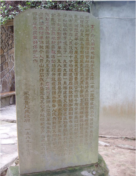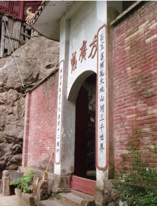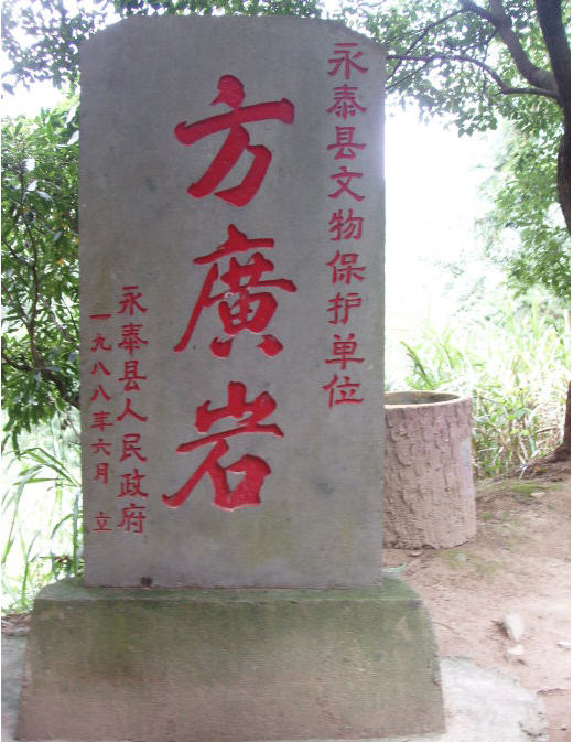 方广岩寺更早记载,当属南宋著名文献故事家张世南的《游宦纪闻》。张世南随父宦游二十余年,多次入闽,在《游宦纪闻》中,有关永泰名胜奇人奇事有六则,这些奇闻传说皆听永泰友人、博学多才的吴信可讲诉。有一则专门记述方广岩的,如此描述:“永福邑东三十五里曰三岛村,村东北山曰方广岩。往昔荆榛蒙茸不可上。给事黄公筑室,读书山下。一日,猎师逐兽归,能言其境。给事命仆,翦荆斫险,攀缘而上,抵一石室,下可蔽千人。乡人从往,即其地奉浮屠,故水旱必于此乎祷。……石室内构三层阁,不载片瓦,虽疾风暴雨,不能犯也。室距平地,可五里许。其间梁空磴险,山径峭拔,游者有攀跻伛偻之难。及最上,峰回路转,倏忽风景不同;岩洞飞惊,台殿缥缈,使人神观轩豁,忘其罢惫。周遭有十奇,如石门、水帘、瀑布、石灯、石钟罄、观音影之类,皆自然天巧。居最者有龙尾泉,状如石龙裂岩而去,尚余不尽。尾、修及寻丈,望之作蜿蜒势。尾锋涌泉一滴,冬夏不枯,人敬其水,以为佛供。越室而右,有羚羊洞,云其中可容三、四十辈。微径仅可着足,下临无际,人莫敢进。独主岩者,藏贮其中,来往如猱,亦野性便习然也。”
