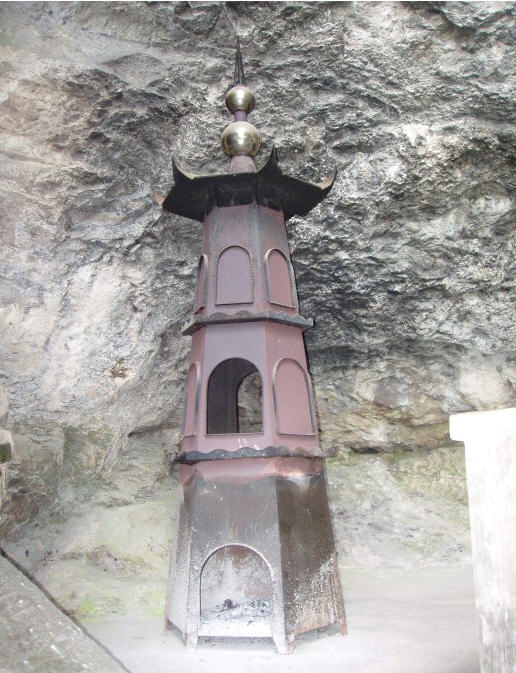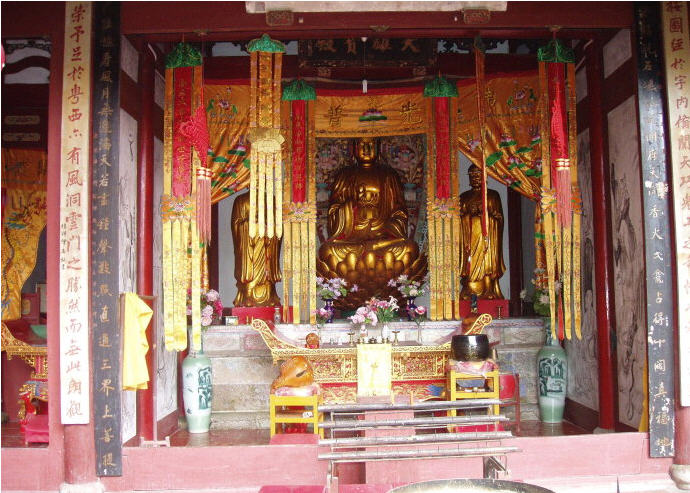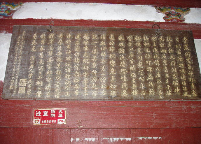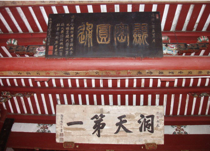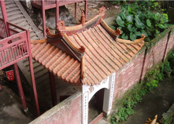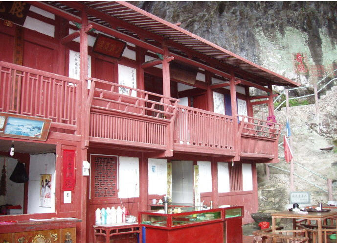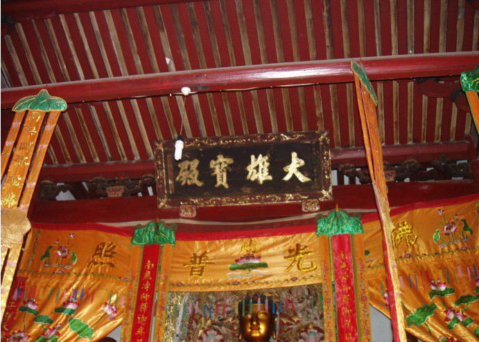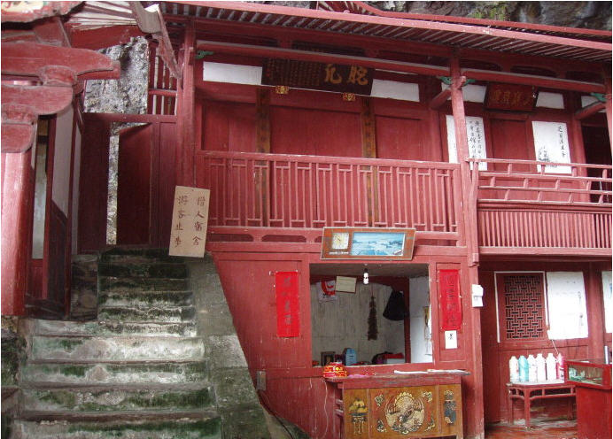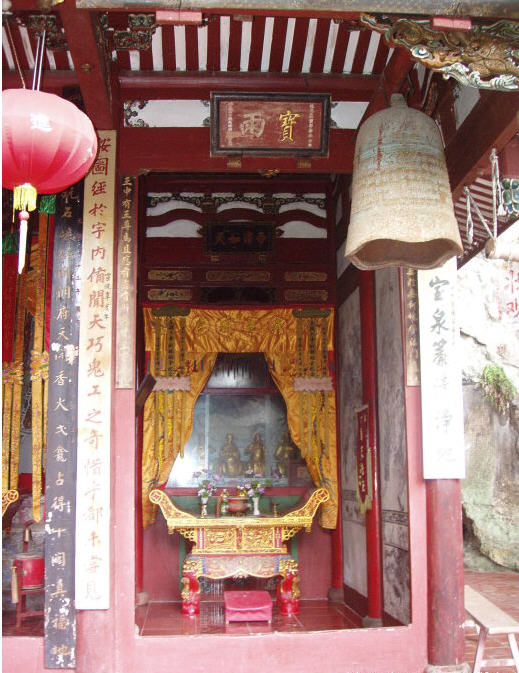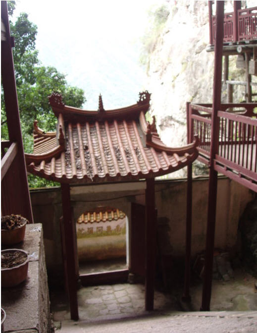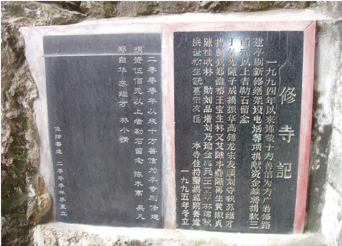 从汤姆森照片中,我们看到当时寺的主殿两边有几扇高大精美的木雕插屏,今天空空如也,成敞开式大殿,悬挂的大钟也不是往昔的那口铜钟,换成了铁钟,已锈迹斑斑。好在寺的建筑物保留了原来的模样。从寺的梁柱上的文字看,现存的方广岩寺为清代建筑,一段入寺石阶,完整保留了宋代原物。
