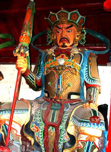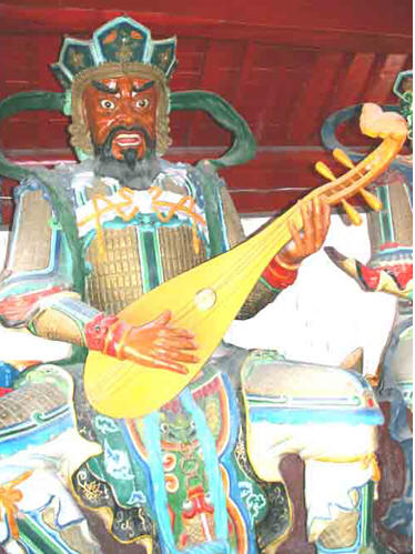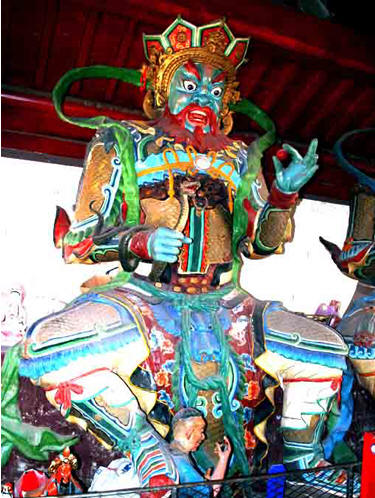 人们把佛祖释迦牟尼称为“本师”,他是最初的“觉悟者”,是佛教中尊贵无比的第一大神。拜释迦牟尼佛可获得无穷智慧与力量。大雄宝殿中供奉的是“横三世佛”。2、天王殿步入下院即可参谒天王殿诸神,殿中央供奉着笑口常开的大肚“弥勒佛,”就是刚才我们在圣水院后山拜的那位弥勒佛,这里就不多讲了。弥勒佛两侧是佛国名声最响的护法神将――四大天王,俗称“四大金刚”。他们站在天王殿里,威风凛凛,煞气腾腾。南方增长天王执宝剑――司风 东方持国天王执琵琶――司调 北方多闻天王执宝伞――司雨西方广目天王执青龙――司顺合起来即“风调雨顺”,寓示“五谷丰登、天下太平”。3、钟、鼓楼青岩寺下院有钟、鼓二楼,在天王殿东西对峙。每天清晨,山寺僧人击鼓鸣钟,惊醒迷途之人。钟鼓二楼为两重飞檐式建筑,气势嵯峨壮观。每逢节日,前来上香之人尽皆纷纷击鼓鸣钟,意为鼓舞斗志,终生不悔。钟、鼓又是佛家法器,可驱恶辟邪,牛鬼蛇神不赶近身,是吉祥平安的象征。