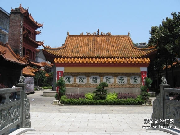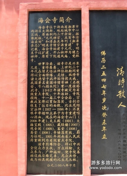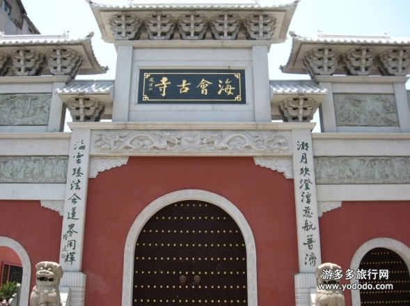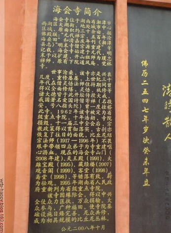 海会寺位于湖南省湘潭市雨湖区大湖街(旧名大墨巷),元僧璞忠建立,为十方丛林,清朝屡经重修,大殿旧有楹联:“鹿苑早传灯,信般若真如,涅槃妙谛,大千界恒沙浊世,相期普渡菩提,村化七家余,数桐叶为秋,几历罡风销浩劫;龙华今与会,溯南湘佛地,元朝禅宗,五百年沧海桑田,何幸重新莲社,堂开三个后,看绿荫无恙,好凭香火结良缘。”