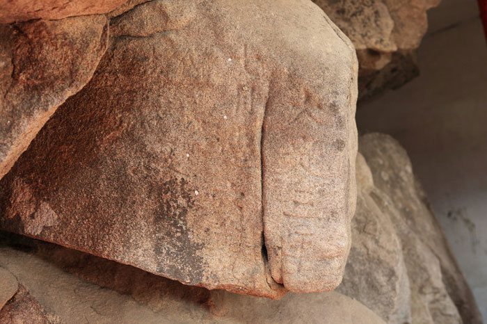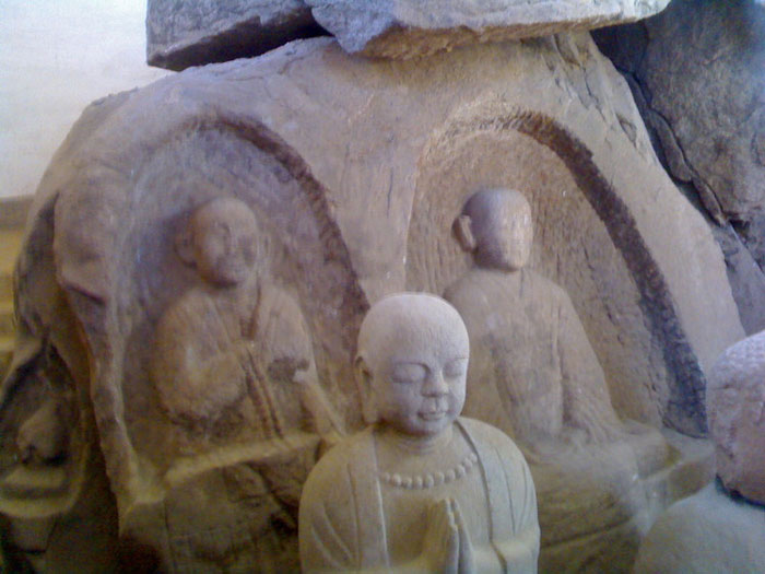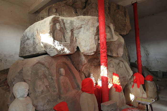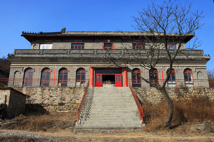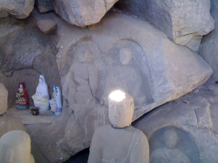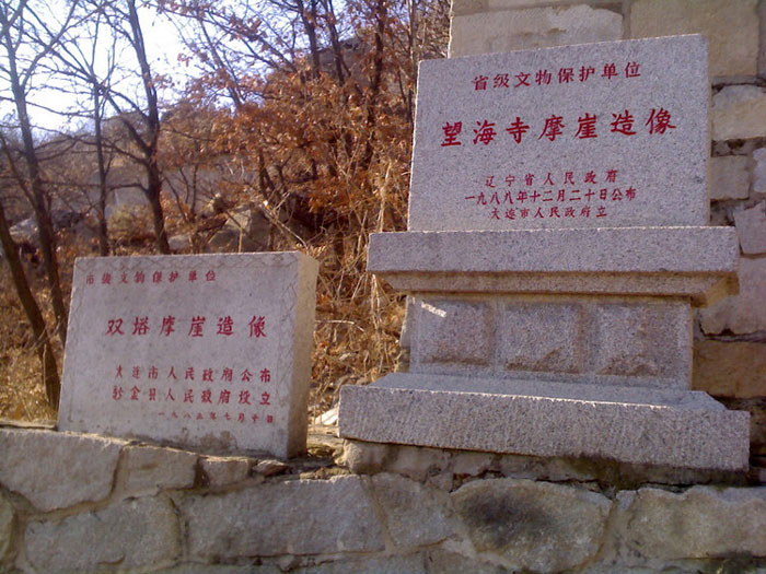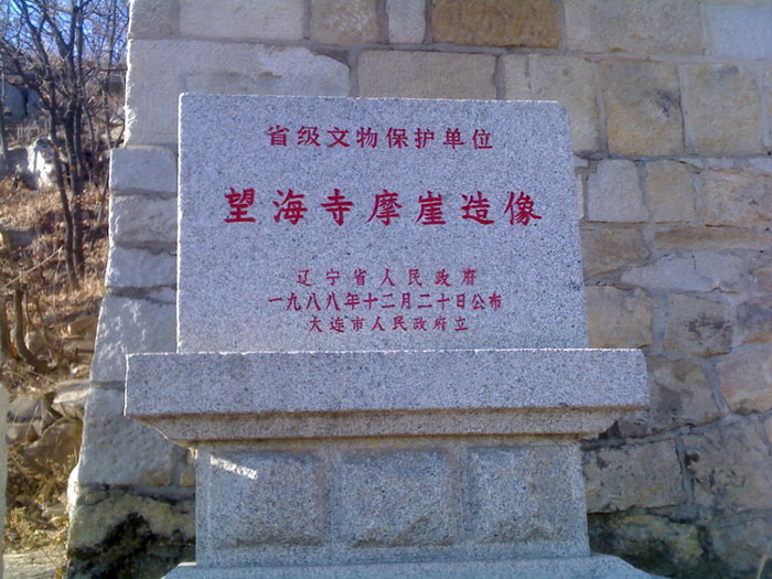 望海寺摩崖造像位于普兰店双塔镇九龙山风景区福全村和尚帽山南坡,是辽宁省重点文物保护单位,始建于金代,距今800余年,是东北最古老的摩崖石刻。摩崖石刻因其东南约20米处有一望海寺,故名望海寺摩崖造像。石刻所在石崖高约5米,长7.26米,原有18尊造像,其中一尊是龛内立像,已被毁掉,其余17尊为浮雕,大部保存完好。造像大小不一,最高者达75厘米。造像中有一尊元龛,一龛为桃形,其余15尊均为上弧下方,其中有两龛相联。造像均为光头,或拱手静坐,或手扶膝跃坐,或手持捻珠。纵观群像,皆圆满丰润,高鼻方耳,衣纹采用阴阳线浅刻手法,精犷有力,古朴大度。为保护摩崖造像,在摩崖造像外建了一座石屋,但这也破坏了景观。