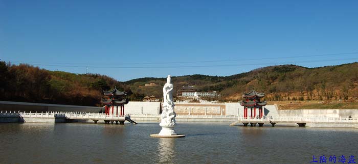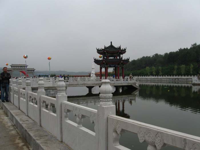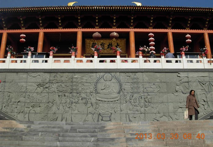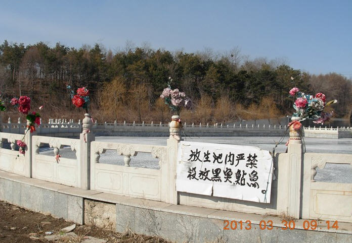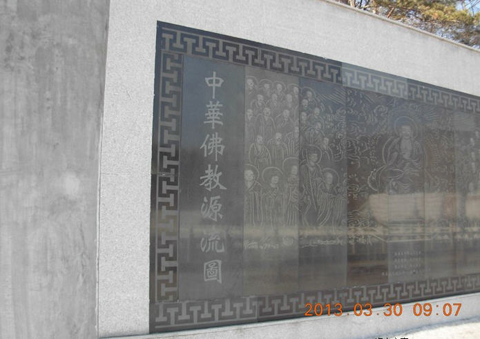 牌坊内侧便是放生池。放生池为如意形,长100米宽50米,水深4米。周边广场为人造大理石铺面,连同四周绿地,总面积达3000平米。池中央供奉观世音菩萨汉白玉站像一尊,连同汉白玉基座高4.2米。塑像玉质晶莹洁白,雕工细腻,栩栩如生,面向牌坊。菩萨身后隔半池清水的阶壁上,镶有高4.5米,长30米汉白玉浮雕,九龙展姿,仪态俊丽华美。南侧墙面镶有高4米,长100米黑色大理石,用磨石技法,绘有“中华佛教源流图”,一画一解,画44幅,文字45帘,内容始于释迦出生,止于太虚大和尚。生动地描绘出佛教传入华厦及其发展壮大的全部流程