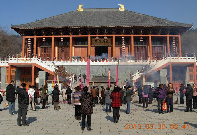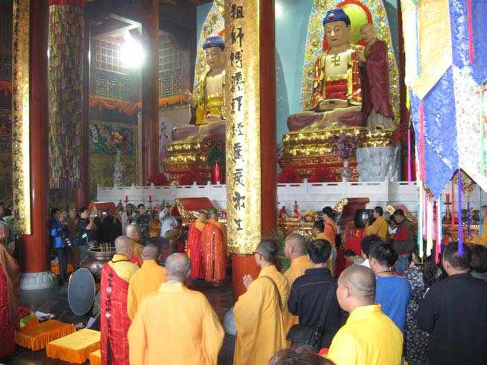 大雄宝殿(大因缘殿),宏伟壮观,仿唐风格。长41米、宽31米、高21米,面阔七间。殿内供奉释迦牟尼佛、阿弥陀佛、药师佛等端坐莲台,像高9米,由香樟木雕刻彩绘贴金而成,妙相庄严;两厢十八罗汉岿然正坐,形神各异。两侧壁画为绢布彩绘十八罗汉故事图。“佛日增辉法轮大转”“宝山圣泉灌浴如来”。此为殿联。殿前匾额“大雄宝殿”四个字,出自清朝大学士纪文达公后裔当代著名书法纪清远之手。