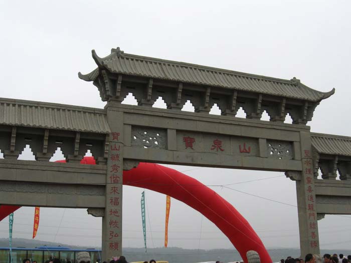 牌坊高挺宽阔,高7.9米,宽16米,汉白玉嵌砌三门式结构,“宝泉山”三个大字赫然醒目。观此牌坊必知此处不同凡响。