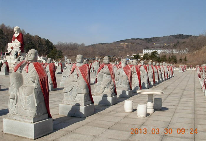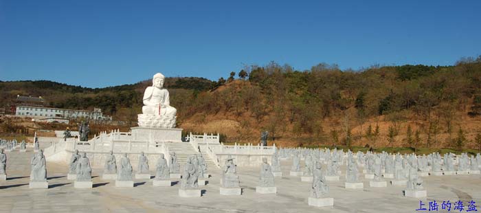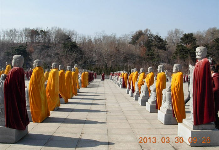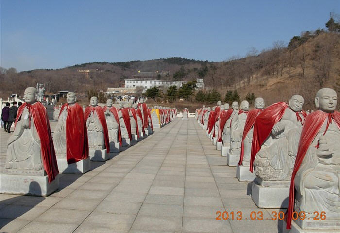 罗汉广场占地2000余平米,人造大理石铺面。中央供奉释迦牟尼佛汉白玉坐像一尊,连同玉石基座高8米。坐像前后左右均为队列罗汉,号称500罗汉,从第一尊到第500尊,每位罗汉的名号都镌刻在基座上。罗汉像由河北曲阳汉白玉雕塑而成,因身姿各异、神态不同,像高便随之由1.3米至1.8米不等。