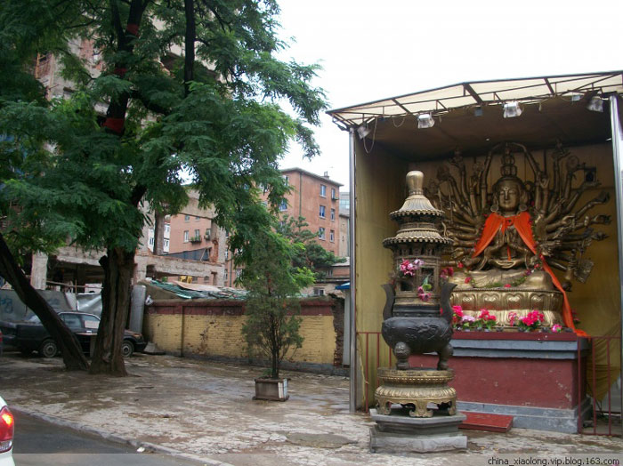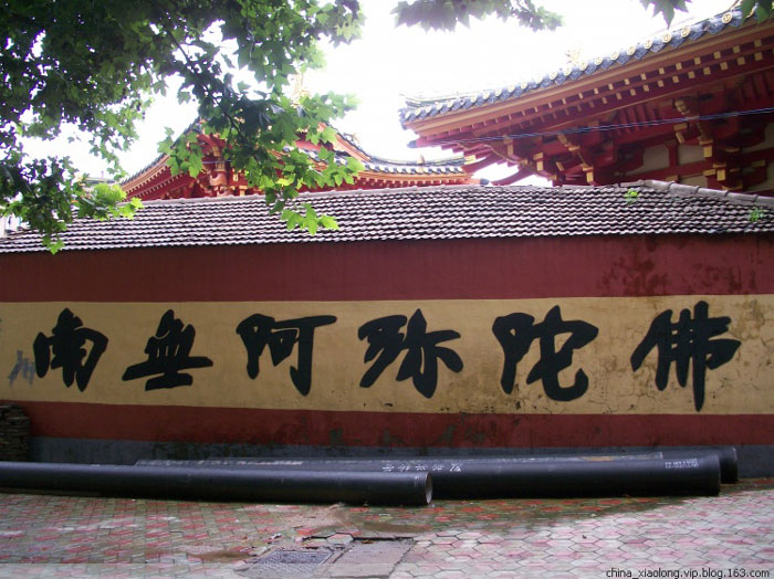 从寺外望去,多见断壁残垣,破门虚掩,细心一些的,方能从满目破败中看到斜伸出的红漆飞檐,透露着一丝飘逸洒脱的灵秀之气。临街的大门常常紧闭,悄无声息,唯有围墙上遒劲有力的“南无阿弥陀佛”六个大字中规中矩地伫立着,无所从来,亦无所去,如如不动,于喧嚣繁杂的城市气息中凸现着佛家的淡定从容。