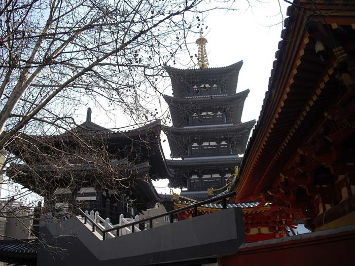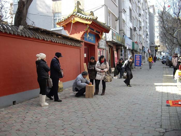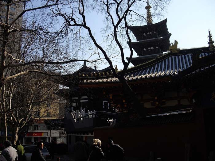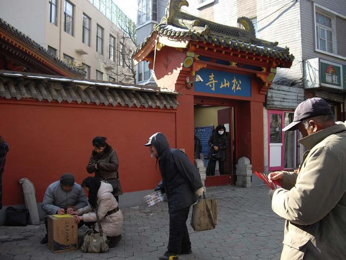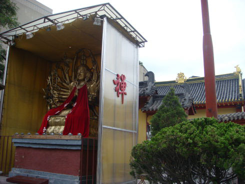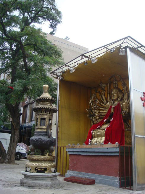 去过两三次后,偶然发现弥勒殿旁有一窄窄的通道。经仔细观察,未见通道口有“闲人免进”字样,于是惴惴地走了过去。没想到转过殿后,竟另有洞天,一方四合小院祥云笼罩,吉祥殊胜。正中大雄宝殿,三世佛庄严无比,殿内两侧罗汉肃立;东西殿规模小了许多,各供着东方三圣、西方三圣。身后则是伽蓝殿。四面殿堂不论大小,皆是鲜亮光明,金碧辉煌,清净无染。虽然与大街只隔一道围墙,却听不到任何人车喧闹。拜垫都摆在狭窄的院子里,似乎只要站在原地四处转身就都拜到了。院子里没有树,没有任何多余的装饰,虔诚的信众挤满了整个空间,人虽多,却总是井然有序。其间也多见或老或少的义工在忙碌着。说来也奇,只要一进到这个院子,顿时会感受到佛菩萨的殊妙庄严,慈悲接引,世间种种贪欲痴念如冰融雪消,当下清静更无杂想,以致每每走出寺院时都会有种怅然若失的感觉。