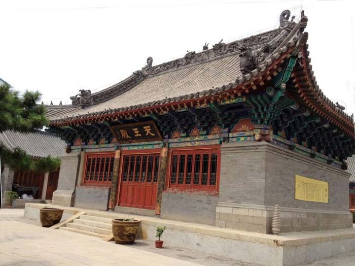 前殿为单檐歇山式建筑,面阔三间,进深三间,东西长15米,宽10米,高14米,前后回廊,殿内外有转角、柱头、补间五铺作斗拱,顶两坡缓长,正脊雕龙,两头有大吻,竖脊雕缠枝花纹,斜脊有跑兽,梁枋施彩绘,建筑宏阔,雄伟庄严,从木架结构和建筑风格看,是典型的明朝遗构。殿内有白玉佛一尊,为1988年寺僧从缅甸请来。