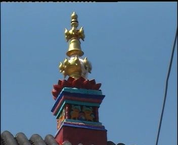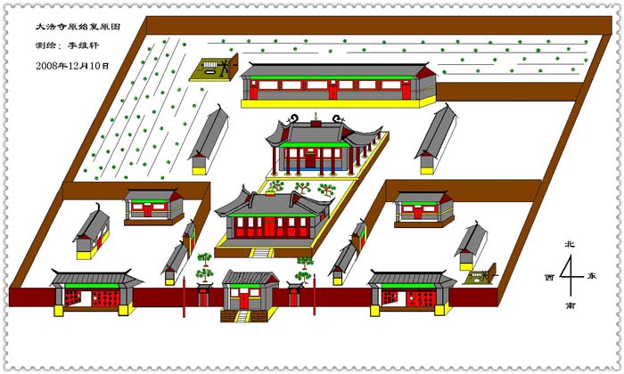 大法寺在现今凌源市四合当蒙古族乡奈曼营子村(aimaγ qoroγ-a, 即前述乃马营子),是县级文物保护单位,目前不知其藏语蒙古语名称。根据观察和当地採访,画寺庙示意图(见上)。另外门前县级柏油公路“四官营子—百牛群公路”,隔开寺庙院落和摩尼轮的石亭子(如图),经常有大小机动车呼啸而过,惊动丘陵起伏间的小村。