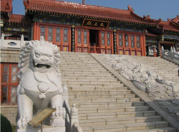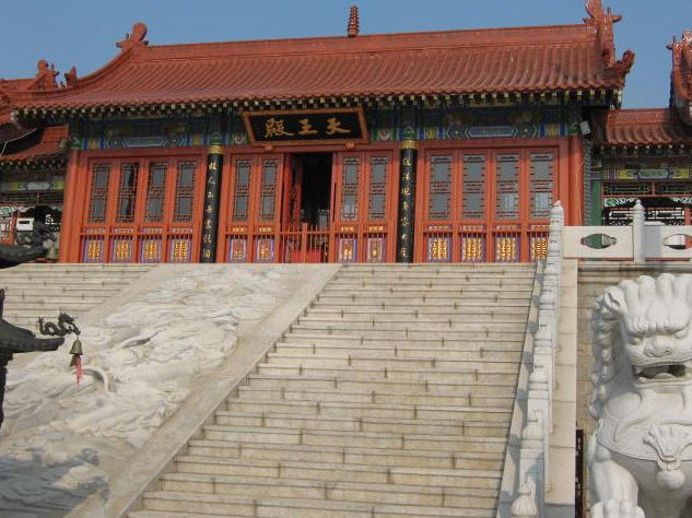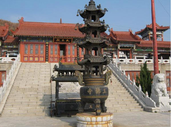 玉佛寺座位于甘井子区红旗镇柳树街成园温泉山庄的东北侧山坡上,玉佛寺为三层大殿结构,气势虽不说能比得上名山古寺那样宏伟壮观,但琉璃红瓦气势不凡。大红灯笼悬挂于庙檐之下,随风飘舞着金黄色的灯穗。与之相对应的是在大门上侧的黑底金字的牌匾,书写着"天王殿"单个刚劲大字。