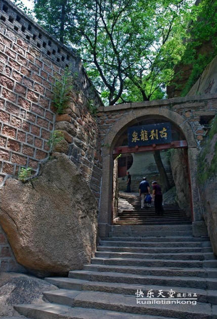 山门位于弥勒殿西下方,歇山式建筑,砖石结构,面阔一间,券门,门楣上有砖雕缠枝花纹,拱门上有砖额,外面题刻“敕建龙泉”,里面刻“金轮永镇”,竖刻“万历三十八年四月吉旦立,奉敕重造。”向内过“法水常流”,经“三星石”右折为地第二道山门,依崖石筑,拱门,门洞东壁石崖上镌“龙泉洞天”四字,字体浑厚,为明隆庆五年(1571年)侍御胡公所题。
