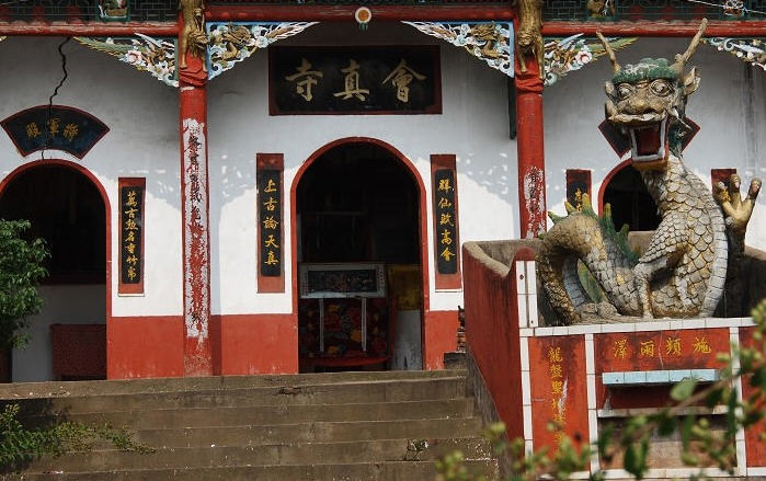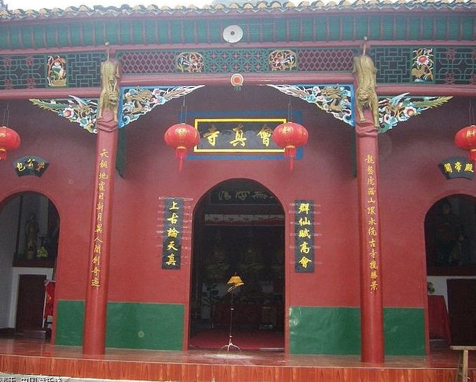 正殿凡三进,依山势而升级。前殿榜额“会真寺”三字大匾,中奉包公,左祀关帝,右祀杨泗将军。三神各据一殿共有三门,中门有联云: