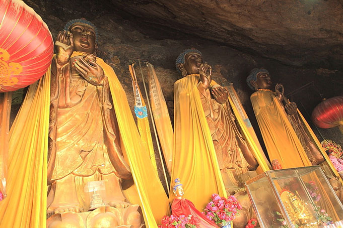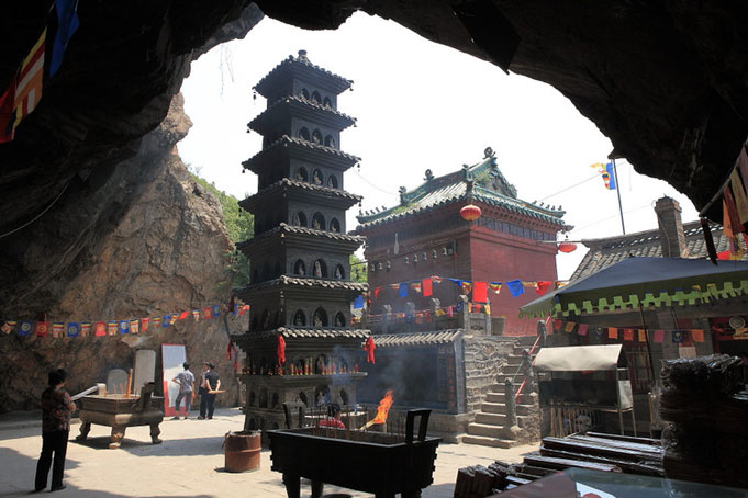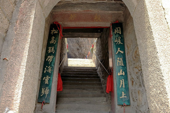 最早的观音阁依山就势而建,至今可见岁月沧桑,前面是石亭和望海楼,站在这里,可以看到黄海大窑湾风光和映掩在绿树丛中的近年来开发区城区一角,望海楼后上方是观音阁正殿和禅房,正殿上面,是一堵巨大的石崖,高十余米,冷眼一瞅,有一种亲临天塌地陷现场之感,让人心存余悸。石窟下面,有一眼黑黝黝的泉井,井水不深,却十分清冽甘醇;石窟上方,有一个看似深不可测的石洞,向主峰方向通去.传说这眼泉水叫地穴,那个石洞叫天穴,是当年两个和尚斗比法力时留下的遗迹。