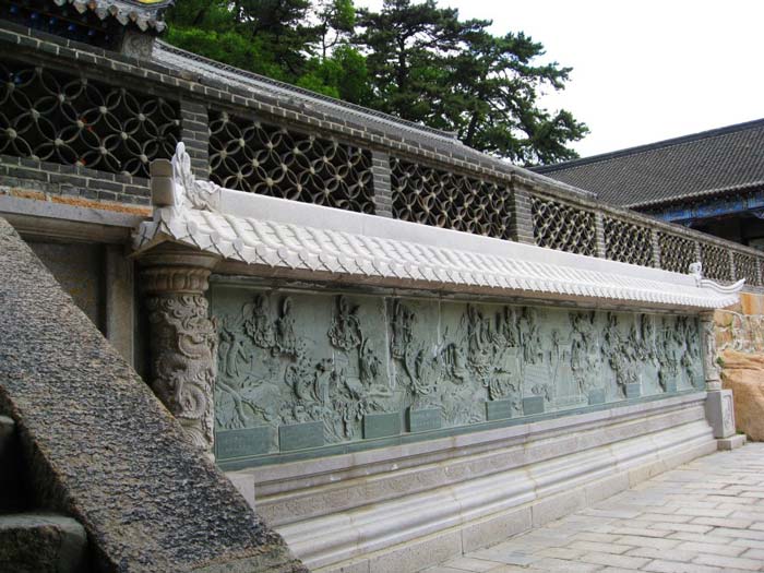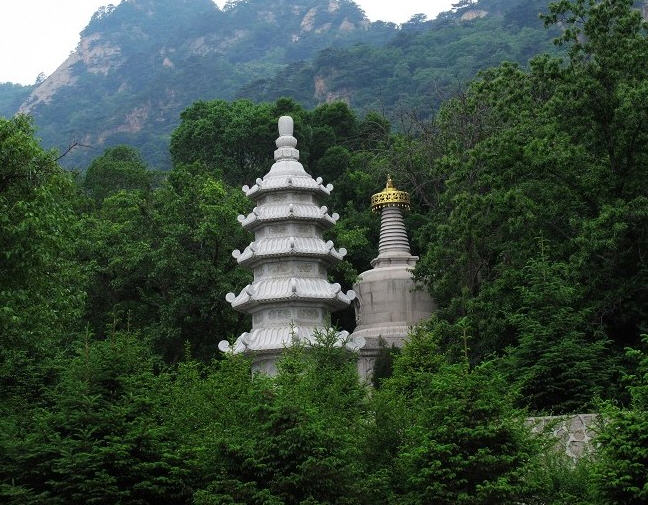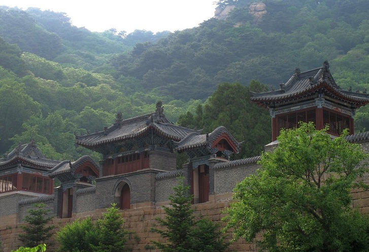 位于五老峰南坡上有一白色砖塔,高2米, 四棱形呈白色,远看如瓶,故名为净瓶峰,塔基甚小,仅能容五六人并肩而立,足下百丈深崖,令人毛骨悚然。从西向东望去,大殿斜脊呈八字形,两边跑兽排列有序,大尾直竖,形成尖状,远处净瓶峰上白色的宝塔与大殿斜脊前后相叠, 高低错落,构成一幅美丽的图画,又称斜脊宝塔。