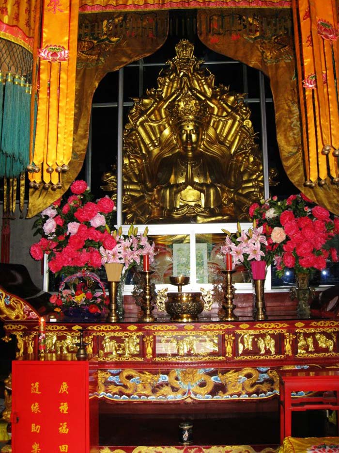 天地楼对面是一棵三百年的古柏,此树有淡淡的香气,也被称为香柏树,在树后是观音殿,殿门前上有一幅楹联“大慈大悲观音愿,救苦救难菩萨心”,是说观音是世间最具同情心的大慈大悲救难菩萨。殿内供奉的是千手千眼观音。它是观音三十三法身之一,相传她有二十五只手和二十五只眼睛,每只手和每只眼睛都有40种法力,故称为千手千眼。两侧为文殊和普贤菩萨。他们分别骑着狮子和大象,代表着智慧和真理。殿两侧还有十八罗汉,整个观音殿内也都是铜佛为主。