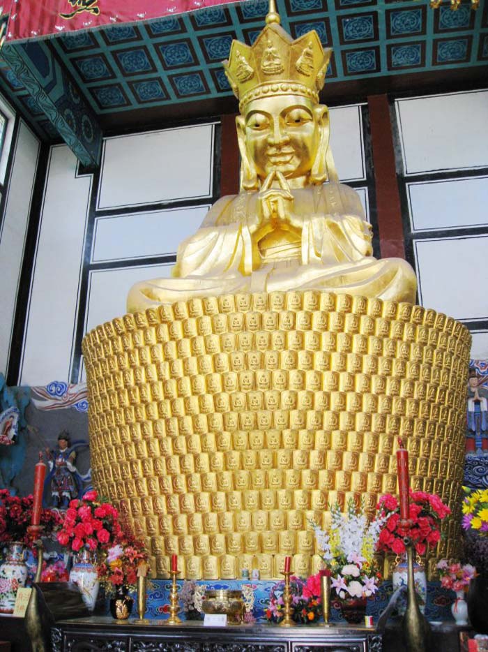 绕过观音殿为中会寺正殿祗圆法界,这里是高僧讲经 的精室美舍,中国供奉着佛主释迦如来,整个殿庙重建于明万历八年,面积100平方米,硬山式建筑, 原为透龙映脊上二龙用铁铸成,为千山中绝无仅有之奇观,殿内供的横三世佛,中为释迦如来,右为消灾廷寿药师佛,右为阿弥陀佛,东西为韦陀,西面为伽蓝菩萨。
