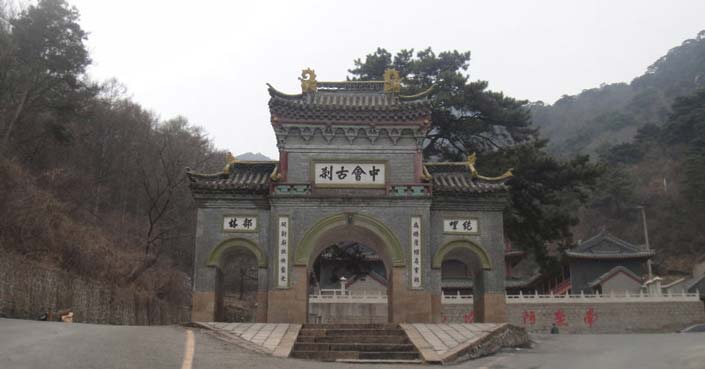 中会寺山门修建于民国23年(1934年),此山门是千山为数不多的排楼式的建筑,而在山门上有一副对联写道“为涤尘襟寻宝刹,愿新庙貌焕灵光”,在横额上写道“中会古刹”四个字,这也是中会一景,这副对联意思是说人们远离尘世的喧哗与烦恼,来到了僻静的古寺,希望崭新的庙宇能焕发出神灵的光茫,庇佑着虔诚的人们。两侧山门上有“林部” “哩汔” “祗垣”和“觉场”等,这些都是佛教用语,是指中会寺是僧人们练功和休息的精室美舍。“尚礼松”如一位忠诚的哨兵守卫在山门前,又有如彬彬有礼的门童在欢迎诸位的到来,它已经在这里有400年的日日夜夜。