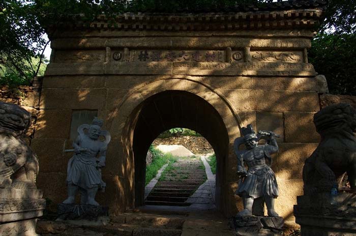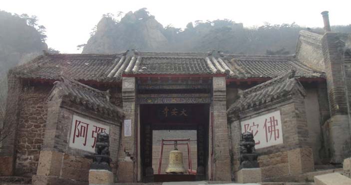 大安寺不仅景色秀丽,而且大多景物都有优美的传说,为游人所乐道,成为有志猎奇探险者必至之地。沿通幽曲境蜿蜒而行,山重水复中忽现大安寺山门,整个门高4米,宽6米,粗粒花岗岩所建的,这是一座建于清道光八年,重修于道光十三年的单檐歇山式建筑,造形宏阔,朴素典雅,门楣上刻有“敕建大安禅林’’之语,而且两侧各一个“日”与“月”字,其含义是为大安寺与日、月同辉,光茫四射。门前有石狮一对,分列两侧,系方丈童灵立于民国二十四年,每只重达一吨,造形逼真,神态各异,雄踞于级:弥座之上,大有威霞山林之势,128人组成64副杠, 如同抬轿一般抬上山来,竞耗时三日之久。沿山门拾级而上,几经曲折,古松翠柏之下,有一个重达千斤的大钟,上印有“大明嘉靖九年八月十五日造”,看到此钟,就可以想到,为当时没有高大坚固的钟楼建筑,则无法铸造和架托此钟,表明大安寺的建筑规模日益扩大,雄踞一方,从而吸引着大批游人,看完大钟,大家随我信步几级台阶,来到寺庙门前,凭栏远眺,环寺五峰, 一览无余,使人兴趣盎然。