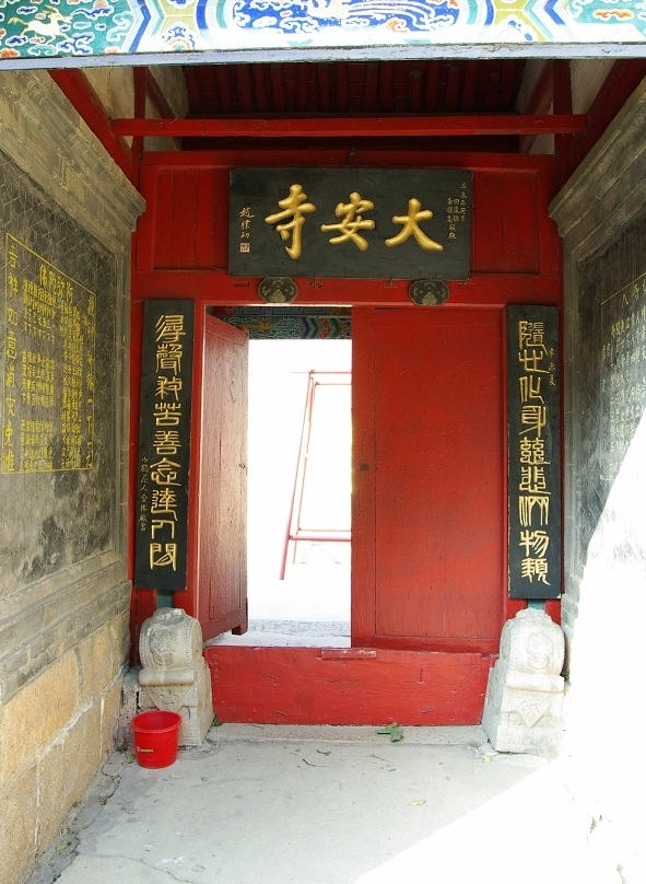 山门为歇山式建筑,砖石结构,面阔一间,大脊雕二龙戏珠,两端有大吻。石券门楣上横刻“敕建大安禅林”六个字。山门两旁是石砌断崖,门外两旁有石狮一对,是民国24年(1935年)方丈童灵所立。