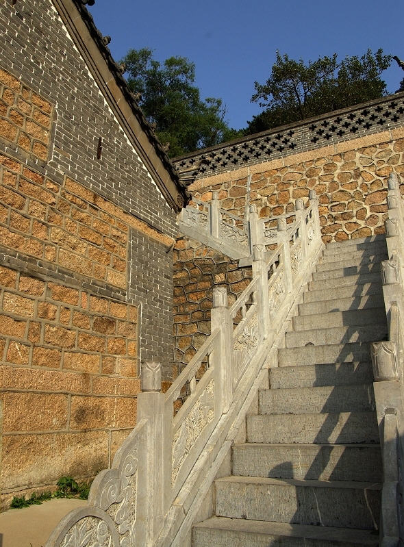除正殿的单檐歇山式建筑外,其余都较完整地保持着清代单檐硬山式的建筑风格。我们先来到了庄严的庙门前,门的两侧题写着让人深思的双联是“常记大师悲勿切,匆忘世上苦人多”之句,让人摸不到头脑,再一看啊!原来这里是妙湛大和尚纪念堂,打开庙门,我们信步来到了宽阔的庭院之中,看到了 一个白色的覆钵式建筑分三层,上面是汉白玉,中间为雪花石,下面是花岗岩所建,白色素雅之塔,是妙湛大和尚舍利塔。“妙湛大和尚”让我介绍一下这位受人敬仰的大和尚口巴!大和尚原厦门南普陀寺方丈,闽南佛学院院长,佛教慈善基金会会长,曾创寺办学,修建正定、正义、正念飞正行等楼舍,复修佛教养院。大和尚生于1910年11月12日,于辽宁丹东,40岁出家,42岁在北京拈花寺受戒,为修三藏佛学,后在扬州高灵寺修行佛法,最后落成一代巨德。1957年,十年动乱期间,老和尚为保护南普陀寺免受劫难作出巨大贡献。1995年,老和尚在12月19日南普陀寺安祥圆寂,临终之时,曾留下“勿忘世上苦人多的”遗言,就是大家看到门上题写的对联,而且,老和尚炼出五色舍利,因为大和尚是辽宁丹东人,而且与大安寺有着不解之缘,所以生前愿望把他的五色舍利存放于大安寺中,大家所见到的白色覆钵式建筑舍利塔是妙湛大和尚的,后人又说到:塔在寺中,寺在大自然之中,老和尚留在人们心中。看完了妙湛大和尚舍利塔,仿佛大师的话就响在耳旁。几步之间,我们走进了正殿,在一看整个的建筑辉煌飞雄伟、壮观。