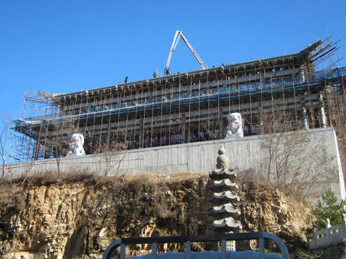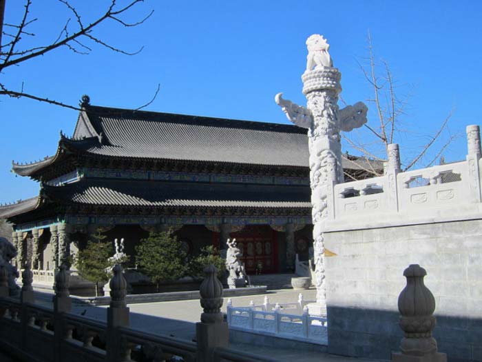 宝华寺从2007年开始进行大规模的建设,寺院内的殿堂众多,现已建好大雄宝殿、七佛宝殿、五方普贤殿、五方文殊殿、五财神殿、地藏殿和五爷殿等,每座佛殿的规模都很大,可谓是雄伟壮观,可惜都是钢筋混凝土结构,与传统的佛教殿堂的建造方式又有很大区别。去的时候还在进行大规模的建设,山顶上正在建设大型佛殿,寺内的工作人员介绍了那座在建的佛殿名称,可惜我的记忆力奇差,转眼工夫就给忘了。由于寺庙里有工作人员走动,又不允许拍照,只能够择机拍了几张。更厉害的是宝华寺内的各大殿之间也建有华表,不得不叫人佩服!宝华寺也是华表的天堂!